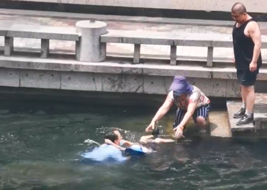 千钧一发之际,正在斜对岸的一位身着蓝色衬衣的大叔听到呼救声,快速冲到现场,果断跳入河中,一把抓住落水男孩的双腿,迅速将其揽入怀中,奋力游向岸边,成功将孩子救起。