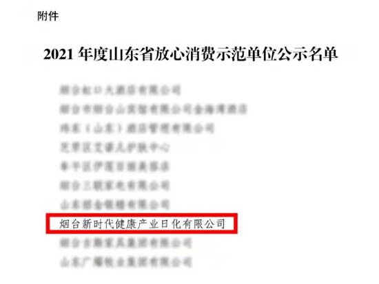 3月8日,继被认定为2021年度“美妆山东”质量标杆生产企业之后,烟台新时代健康产业日化有限公司(以下简称烟台日化公司)再获殊荣,被评为“省级放心消费示范单位”。
