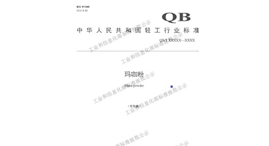 4月24日,中华人民共和国工业和信息化部发布了2022年第10号公告,其中由健康产业公司国珍健康研究院作为牵头起草单位,联合中国食品发酵工业研究院、烟台新时代健康产业有限公司等共同申报的《玛咖粉》行业标准通过工信部审批,将于2022年10月1日正式实施。