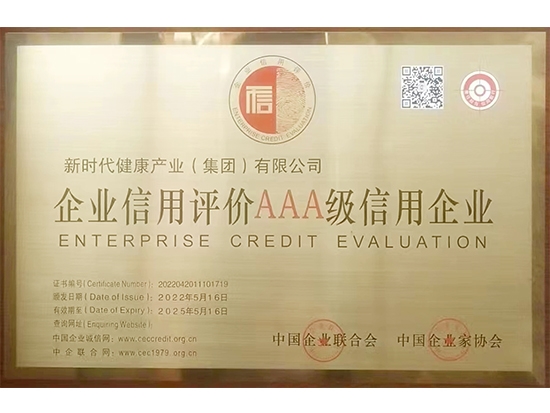 近日,中国企业联合会、中国企业家协会(以下简称“中国企联”)发布了2022年信用企业名单。新时代健康产业(集团)有限公司(简称健康产业公司)凭借过硬的经营管理水平,获评企业信用最高等级“AAA级信用企业”称号,标志着健康产业公司的服务能力、产品质量、管理水平和信誉程度得到社会公认。