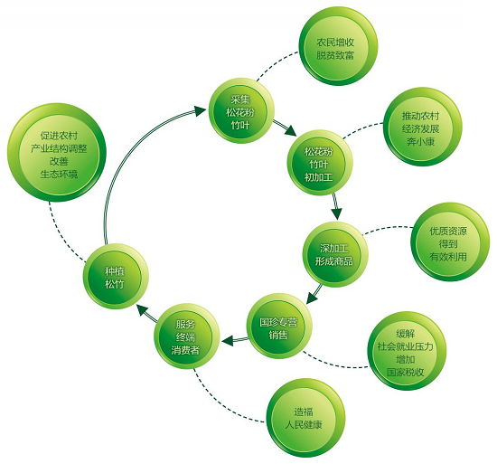 业务发展的同时,新时代集团还一直致力于追求企业发展与生态平衡之间的和谐统一,创造性地构建了“采集松竹原料——初加工——深加工成商品——专营店销售——服务终端消费者——种植松竹”完整绿色生态产业链。把丰富的农林资源变为绿色安全的生态产品,从而实现自然资源的生态价值、经济价值和社会价值,探索出一条生态产品价值实现的发展之路,真正将‘绿水青山’变成了‘金山银山’,这才是新时代集团的价值所在。